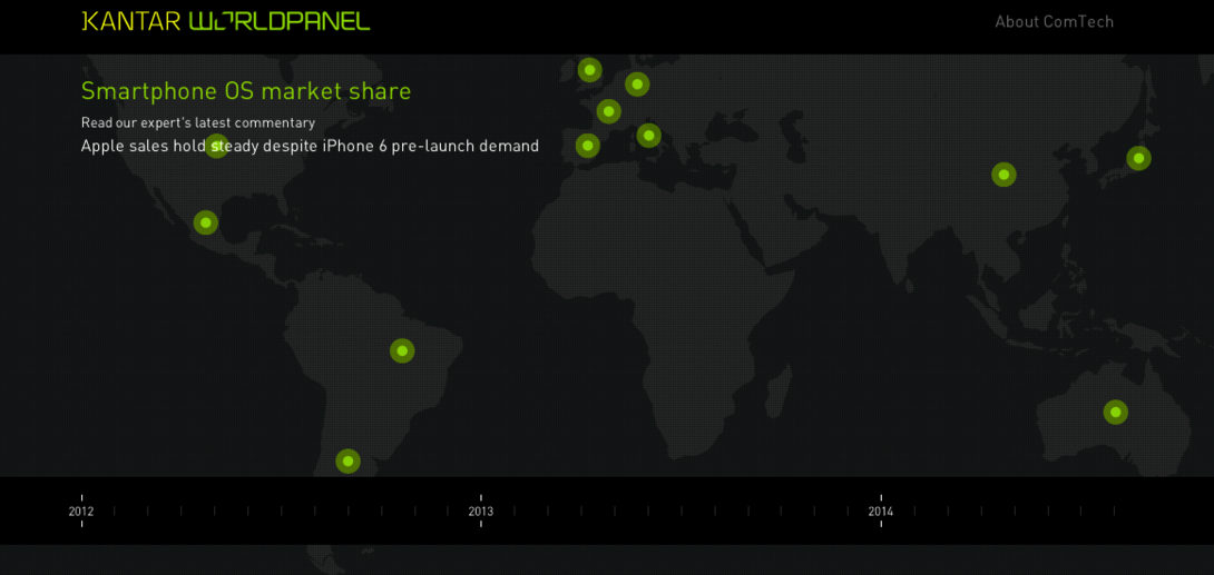 The dataviz provides an increased understanding of the smartphone market shares evolution. Rather than displaying isolated data points only, as in the monthly release, it allows access to all historic information allowing periods comparison in an interactive way. Users can also select different countries and compare the market shares in them. The dataviz works in desktops, tablets and smartphones and its design adapts automatically to the screen size.