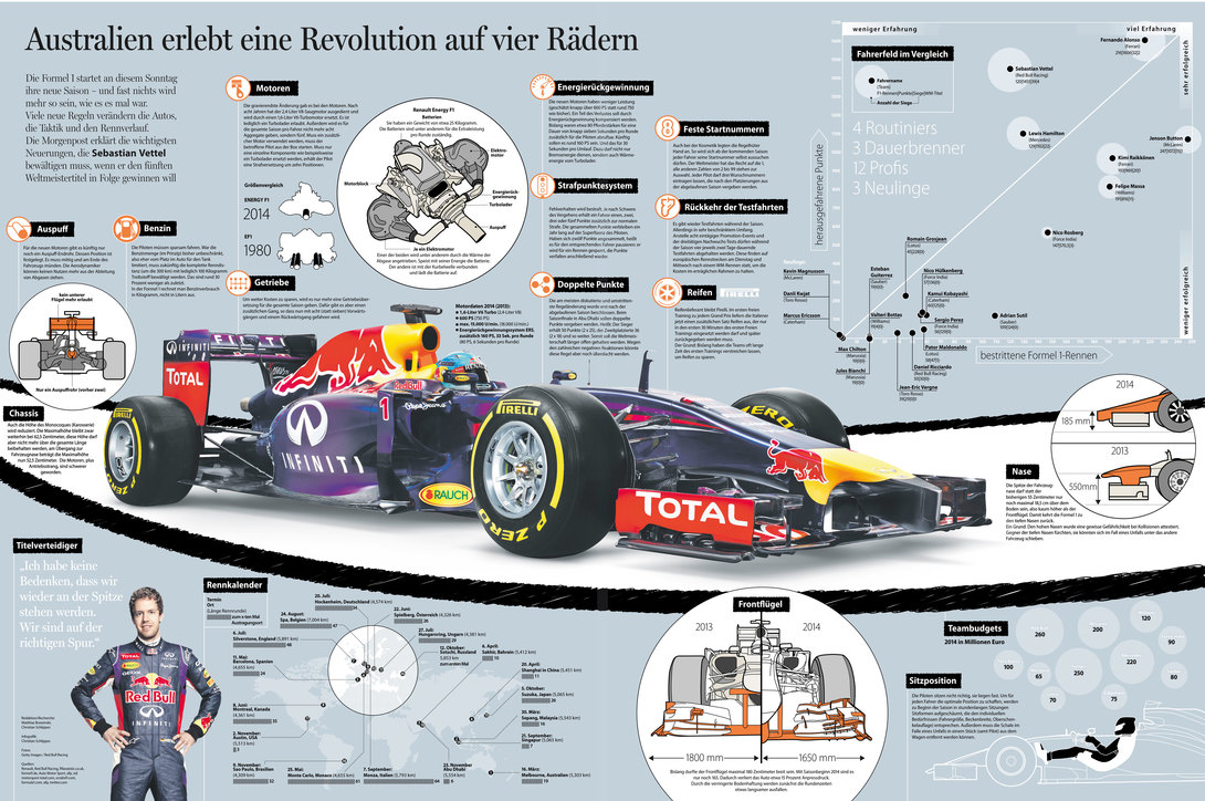 This Infographic shows the changes in Formula One in the season 2014. How the Red Bull Car 2014 had changed to 2013. You can see many informations about driverfield, races, budgets and all new regulations of the new season.