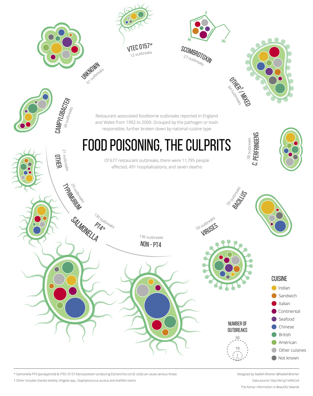 This visualizations shows the number of outbreaks (absolute numbers) per cuisine type as bubbles (where the areas are scaled to the number of outbreaks) grouped by pathogen/toxin. I tried to recreate schematic forms of the pathogens where possible.