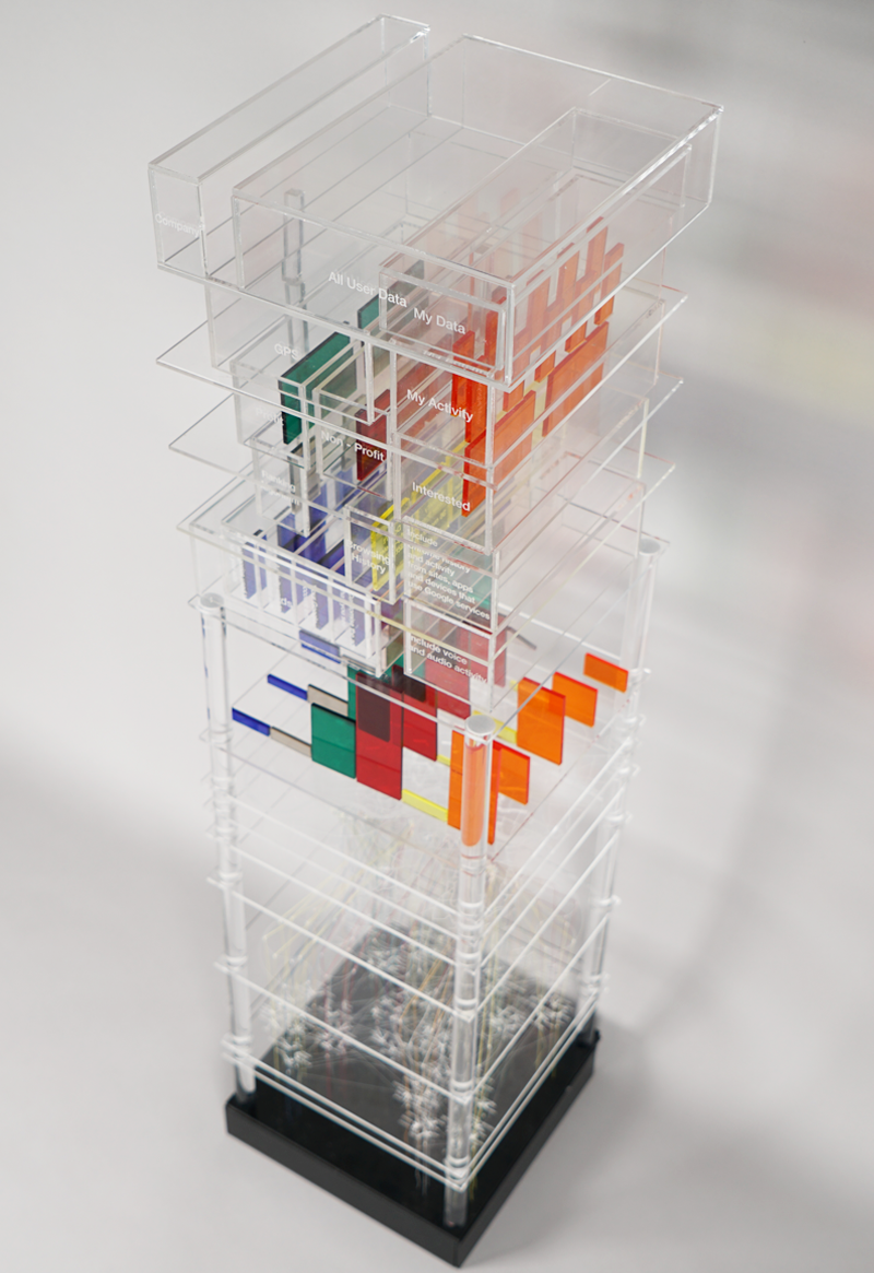 Firstly, improving data literacy by promoting an understanding of algorithms. Secondly, the critical practice that incorporates randomness. I thought our own proactive action to obtain information in the midst of randomness could be one of the possible ways to change the current situation. Google Maps, which is the combination of GPS and algorithm, is unique in that it directly produces behavioural changes in our conduct in physical space. Therefore, I considered visualising what kind of algorithm is used to display Google Maps information to us using diagrams. The critical practice known as corporate randomness is influenced by situationists who advocate exploring cities and artist James Bridle’s conception of randomness as being generated in physical spaces divorced from technology. I devised a “random walk” using dice to traverse the city unsystematically, actively collecting information of personal interest during the arbitrary walks. Subsequently, a technique was devised to visualise this collected information using network diagrams. I walked around London, alternating every 15 minutes between Google Maps and dice rolling. I collected the data on Google Maps (information received passively), as well as the statistics I recorded of interest to me (information acquired actively). Both types of information were analysed quantitatively and qualitatively, respectively, and combined with flow and network diagrams to create a three dimensional model that resembles an architectural reproduction.