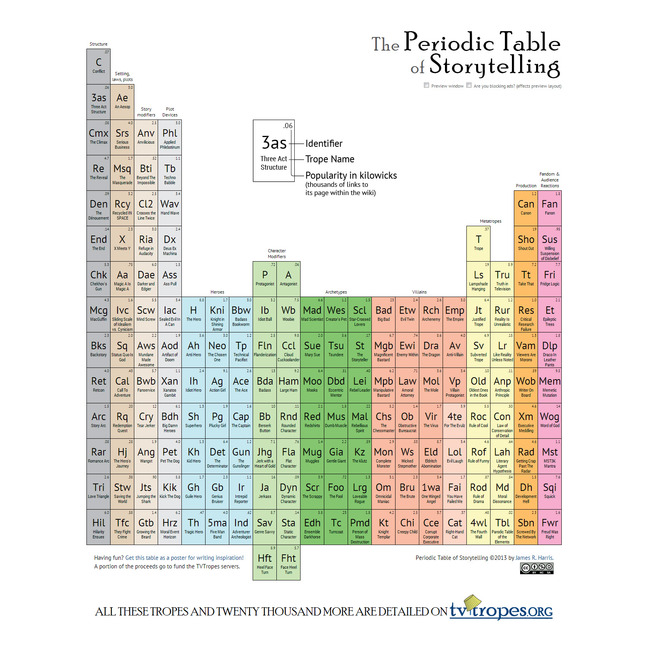 The Periodic Table of Storytelling provides an entry point into TVTropes. Much like Mendeleev's Periodic Table, this infographic organizes the fundamental building blocks of storytelling into easy-to-understand groups. These are the basic elements of story, passed down through the ages; none of them are new, but all of them can be used in new ways and combinations.